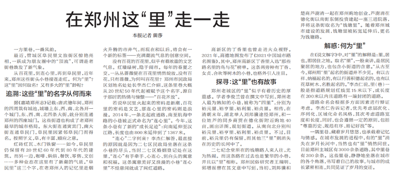 从百花里,到连心里,再到阜民里,近年来,郑州这些街头小巷接连走红。何为“里”?这“里”因何取名?又有多大的“里”龄呢?(今日《郑州日报》2版)