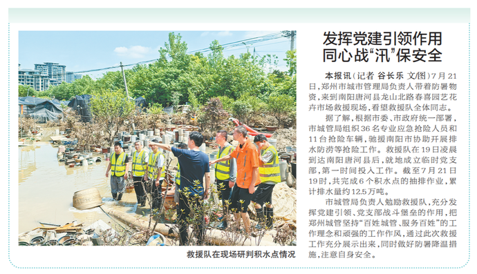 7月21日,郑州市城市管理局负责人带着防暑物资,来到南阳唐河县龙山北路春喜园艺花卉市场救援现场,看望救援队全体同志。(今日《郑州日报》2版)