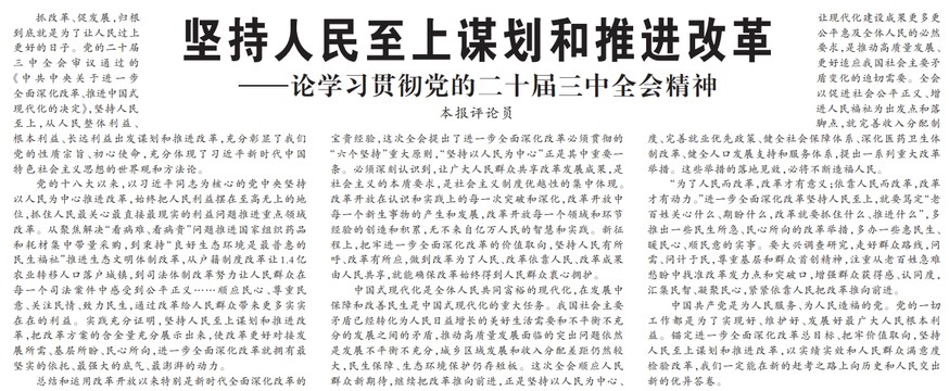抓改革、促发展,归根到底就是为了让人民过上更好的日子。党的二十届三中全会审议通过的《中共中央关于进一步全面深化改革、推进中国式现代化的决定》,坚持人民至上,从人民整体利益、根本利益、长远利益出发谋划和推进改革,充分彰显了我们党的性质宗旨、初心使命,充分体现了习近平新时代中国特色社会主义思想的世界观和方法论。(今日《人民日报》3版)