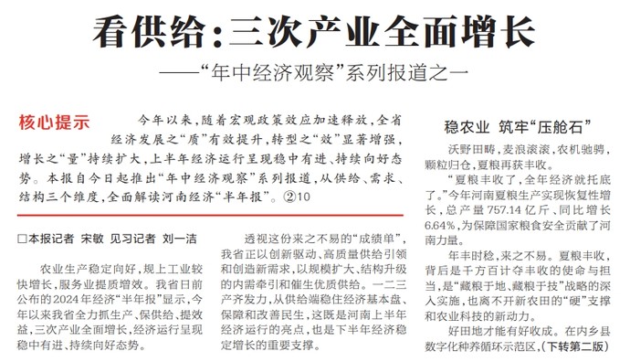今年以来,随着宏观政策效应加速释放,全省经济发展之“质”有效提升,转型之“效”显著增强,增长之“量”持续扩大,上半年经济运行呈现稳中有进、持续向好态势。本报自今日起推出“年中经济观察”系列报道,从供给、需求、结构三个维度,全面解读河南经济“半年报”。