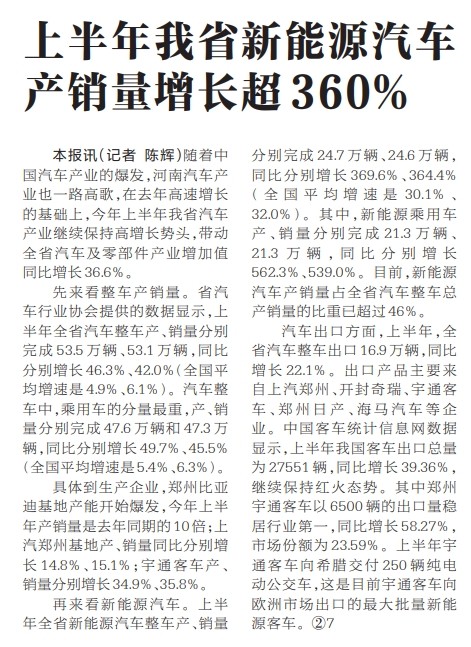 随着中国汽车产业的爆发,河南汽车产业也一路高歌,在去年高速增长的基础上,今年上半年我省汽车产业继续保持高增长势头,带动全省汽车及零部件产业增加值同比增长36.6%。