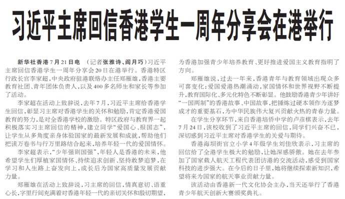 习近平主席回信香港学生一周年分享会20日在港举行。香港特区行政长官李家超,中央政府驻港联络办主任郑雁雄,香港主要教育社团、青年团体负责人,以及400多名师生和家长等参加了活动。(今日《人民日报》4版)