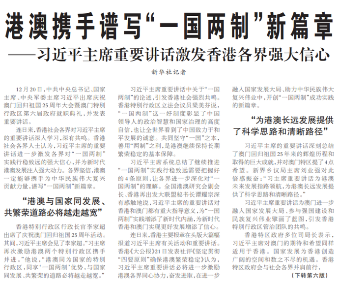 12月20日,中共中央总书记、国家主席、中央军委主席习近平出席庆祝澳门回归祖国25周年大会暨澳门特别行政区第六届政府就职典礼,并发表重要讲话。