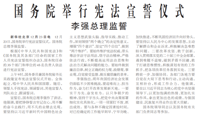 12月23日,国务院举行宪法宣誓仪式。国务院总理李强监誓。