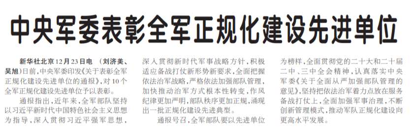 日前,中央军委印发《关于表彰全军正规化建设先进单位的通报》,对10个全军正规化建设先进单位予以表彰。(今日《人民日报》1版)