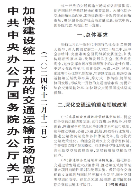统一开放的交通运输市场是有效衔接供需、促进国民经济循环畅通的重要基础。为深化综合交通运输体系改革,加快建设统一开放的交通运输市场,更好服务经济社会高质量发展,经党中央、国务院同意,现提出如下意见。(今日《人民日报》1版、4版)