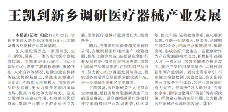12月23日,省长王凯深入新乡长垣市部分企业,实地调研医疗器械产业发展情况。(今日《河南日报》1版)