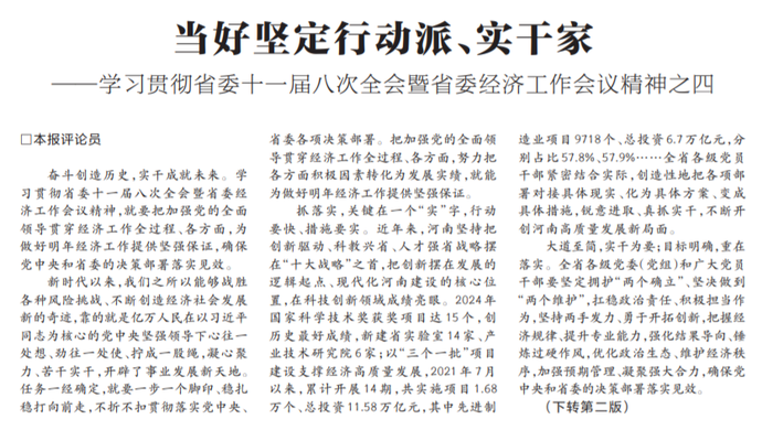 奋斗创造历史,实干成就未来。学习贯彻省委十一届八次全会暨省委经济工作会议精神,就要把加强党的全面领导贯穿经济工作全过程、各方面,为做好明年经济工作提供坚强保证,确保党中央和省委的决策部署落实见效。(今日《河南日报》1版、2版)