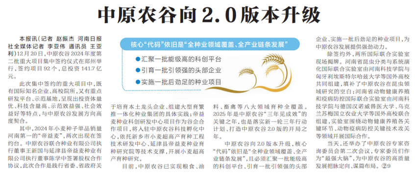 12月20日,中原农谷2024年度第二批重大项目集中签约仪式在郑州举行,签约项目92个,总投资141.7亿元。(今日《河南日报》2版)