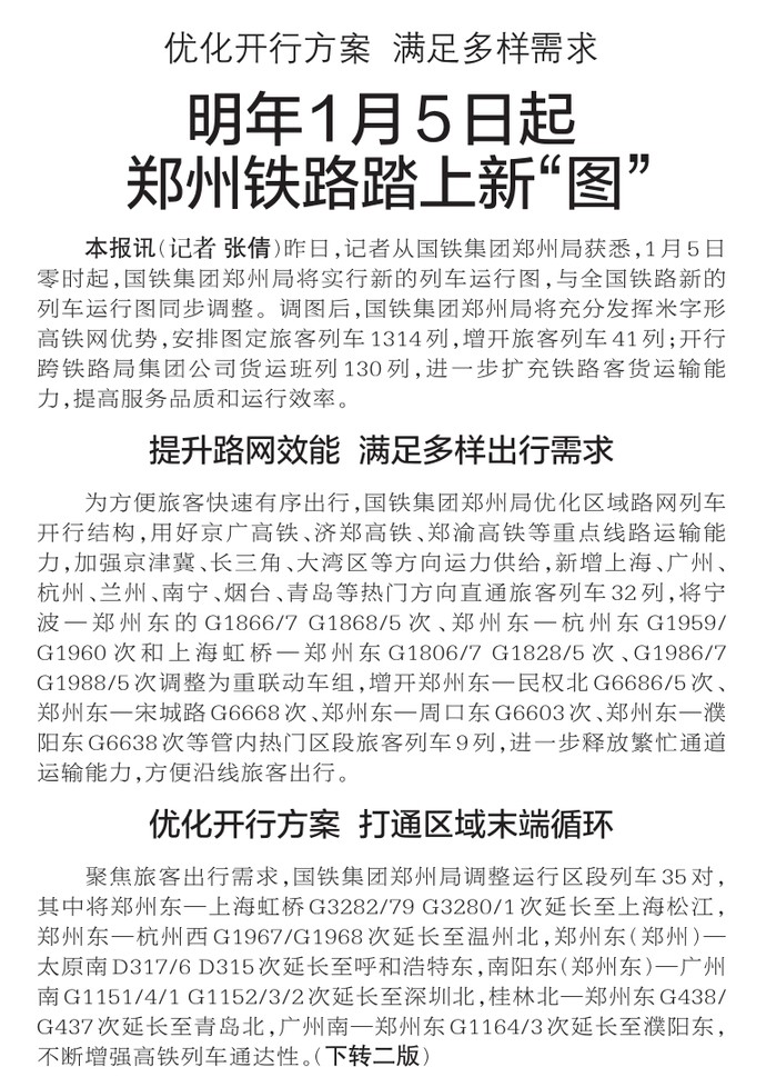 昨日,记者从国铁集团郑州局获悉,1月5日零时起,国铁集团郑州局将实行新的列车运行图,与全国铁路新的列车运行图同步调整。调图后,国铁集团郑州局将充分发挥米字形高铁网优势,安排图定旅客列车1314列,增开旅客列车41列;开行跨铁路局集团公司货运班列130列,进一步扩充铁路客货运输能力,提高服务品质和运行效率。(今日《郑州日报》1版、2版)