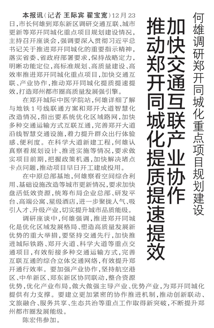 12月23日,市长何雄到郑东新区调研交通互联、城市更新等郑开同城化重点项目规划建设情况,主持召开座谈会,强调要深入贯彻习近平总书记关于推进郑开同城化的重要指示精神,落实省委、省政府部署要求,保持战略定力,明晰功能定位,高标准规划、高质量建设、高效率推进郑开同城化重点项目,加快交通互联、产业协作,推动郑开同城化提质提速提效,打造郑州都市圈高质量发展强引擎。(今日《郑州日报》1版)