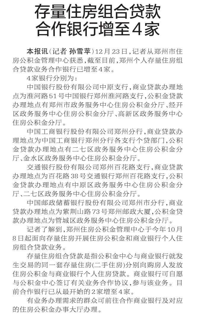 12月23日,记者从郑州市住房公积金管理中心获悉,截至目前,郑州个人存量住房组合贷款业务合作银行已增至4家。(今日《郑州日报》2版)