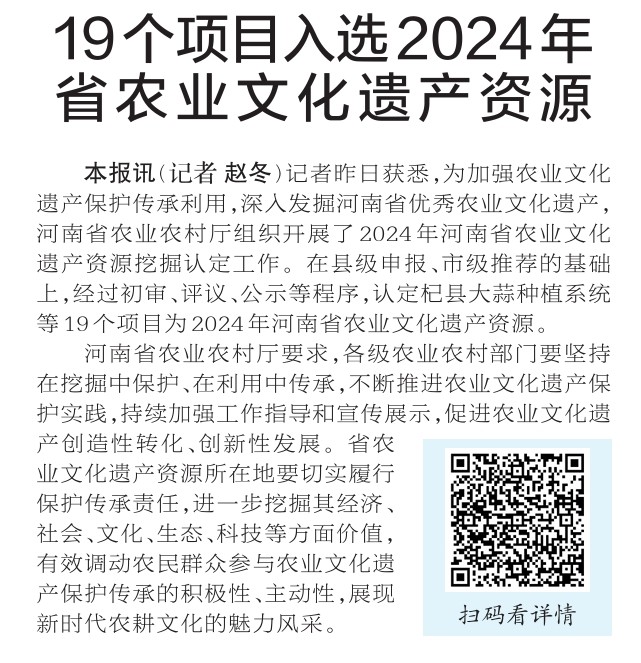 记者昨日获悉,为加强农业文化遗产保护传承利用,深入发掘河南省优秀农业文化遗产,河南省农业农村厅组织开展了2024年河南省农业文化遗产资源挖掘认定工作。在县级申报、市级推荐的基础上,经过初审、评议、公示等程序,认定杞县大蒜种植系统等19个项目为2024年河南省农业文化遗产资源。(今日《郑州日报》2版)
