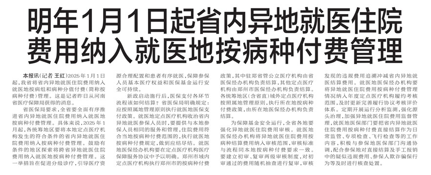 2025年1月1日起,我省将省内异地就医住院费用纳入就医地按病组和病种分值付费(简称按病种付费)管理。这是记者昨日从河南省医疗保障局获得的消息。(今日《郑州日报》5版)