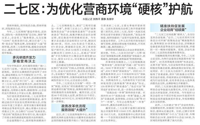 今年,二七区围绕“建设市场化、法治化、国际化一流营商环境”总目标,秉持“群众至上、企业至上”服务理念,大力实施“12345” 优商攻坚行动,倾力打造“二七帮·易企办”服务品牌,加快建设“六最”营商环境,改善二七投资环境,提振企业投资信心,激发市场活力潜力,为区域经济增长筑牢根基。(今日《郑州日报》7版)