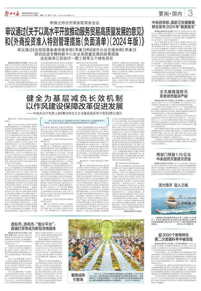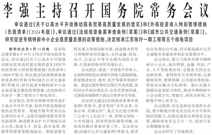 国务院总理李强8月19日主持召开国务院常务会议,审议通过《关于以高水平开放推动服务贸易高质量发展的意见》和《外商投资准入特别管理措施(负面清单)(2024年版)》,审议通过《法规规章备案审查条例(草案)》和《城市公共交通条例(草案)》,研究促进专精特新中小企业高质量发展的政策措施,决定核准江苏徐圩一期工程等五个核电项目。(今日《人民日报》1版)