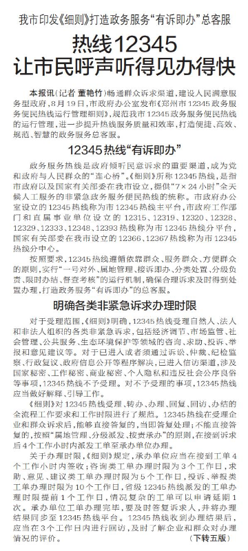 畅通群众诉求渠道,建设人民满意服务型政府,8月19日,市政府办公室发布《郑州市12345政务服务便民热线运行管理细则》,规范我市12345政务服务便民热线的运行管理,进一步提升热线服务质量和效率,打造便捷、高效、规范、智慧的政务服务总客服。(今日《郑州日报》1版、5版)