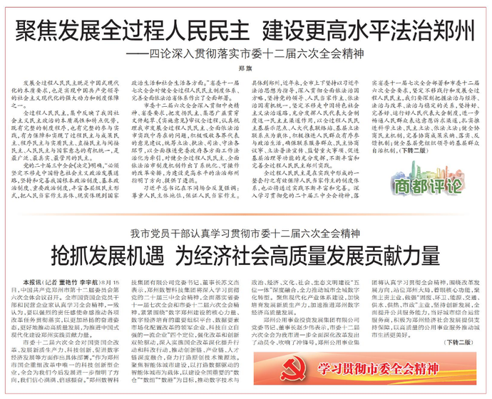 8月15日,中国共产党郑州市第十二届委员会第六次全体会议召开。全市国资国企党员干部和民营企业家认真学习全会精神,一致认为,要以强烈的责任感使命感推动各项改革任务贯彻落实,以更加昂扬的奋进姿态,更好地推动高质量发展,为推进中国式现代化建设郑州实践贡献力量。(今日《郑州日报》1版、2版)