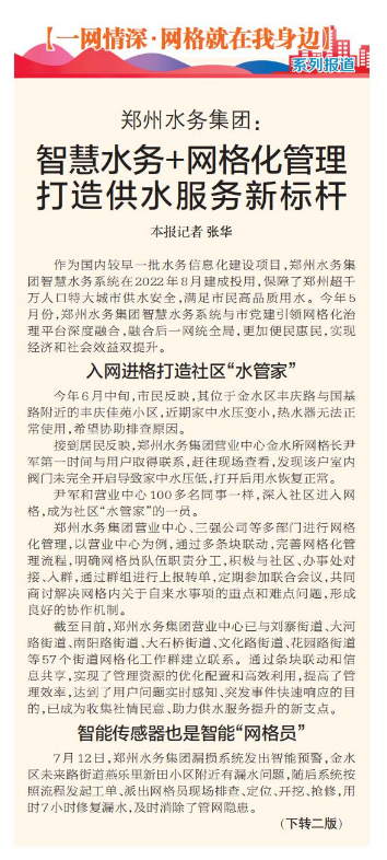 作为国内较早一批水务信息化建设项目,郑州水务集团智慧水务系统在2022年8月建成投用,保障了郑州超千万人口特大城市供水安全,满足市民高品质用水。今年5月份,郑州水务集团智慧水务系统与市党建引领网格化治理平台深度融合,融合后一网统全局,更加便民惠民,实现经济和社会效益双提升。(今日《郑州日报》1版、2版)