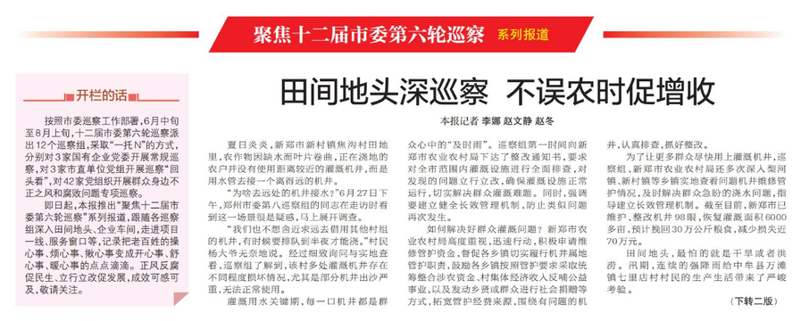 即日起,本报推出“聚焦十二届市委第六轮巡察”系列报道,跟随各巡察组深入田间地头、企业车间,走进项目一线、服务窗口等,记录把老百姓的操心事、烦心事、揪心事变成开心事、舒心事、暖心事的点点滴滴。正风反腐促民生、立行立改促发展,成效可感可及,敬请关注。