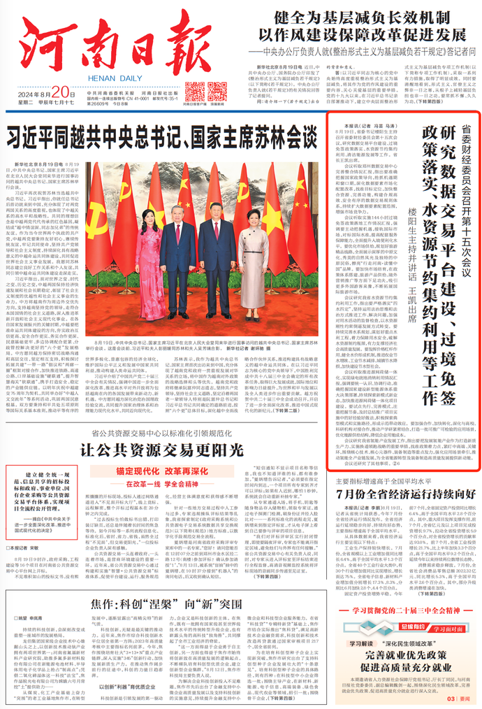 8月19日,省委书记楼阳生主持召开省委财经委员会第十五次会议,研究数据交易平台建设、过境免签政策落实、水资源节约集约利用、清洁能源发展等工作。省长王凯出席。(今日《河南日报》1版)