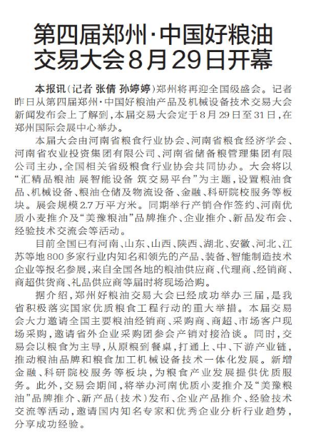 第四届郑州·中国好粮油交易大会8月29日开幕
