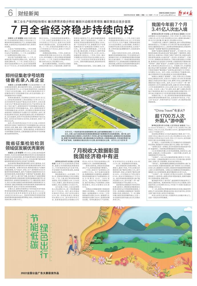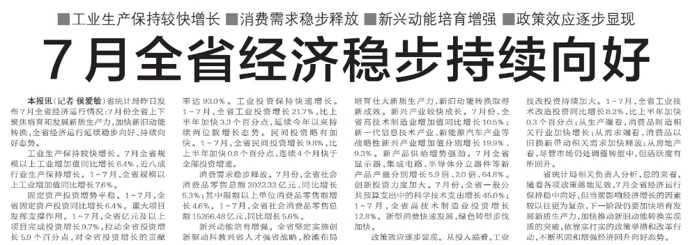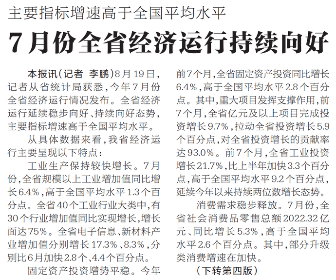 8月19日,记者从省统计局获悉,今年7月份全省经济运行情况发布。全省经济运行延续稳步向好、持续向好态势,主要指标增速高于全国平均水平。(今日《河南日报》1版、4版)