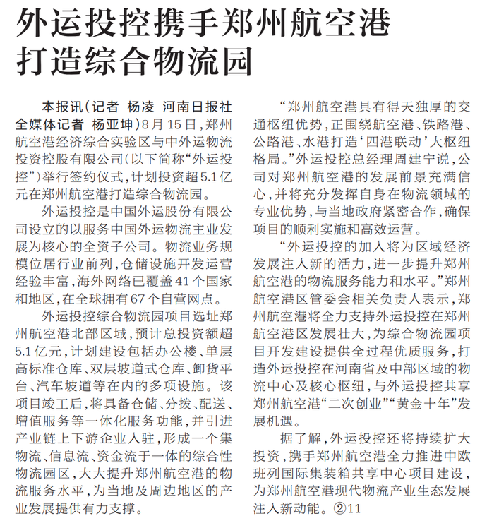 8月15日,郑州航空港经济综合实验区与中外运物流投资控股有限公司(以下简称“外运投控”)举行签约仪式,计划投资超5.1亿元在郑州航空港打造综合物流园。(今日《河南日报》2版)