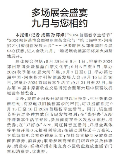 “2024首届智享生活节”“2024郑州茶博会暨福鼎白茶文化节”“第七届中国·河南招才引智创新发展大会”……记者昨日从郑州国际会展中心获悉,进入金秋九月,一场场展会盛宴即将如火如荼地展开。(今日《郑州日报》2版)