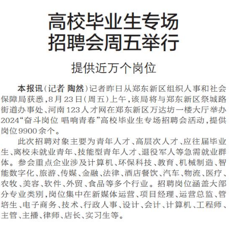 记者昨日从郑东新区组织人事和社会保障局获悉,8月23日(周五)上午,该局将与郑东新区祭城路街道办事处、河南123人才网在郑东新区万达坊一楼大厅举办2024“奋斗岗位 唱响青春”高校毕业生专场招聘会活动,提供岗位9900余个。(今日《郑州日报》2版)