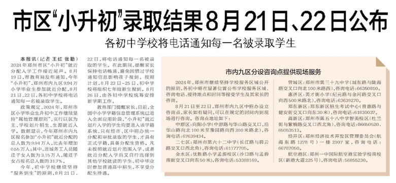 2024年郑州市区“小升初”就近分配入学工作接近尾声。8月19日,市教育局发布通知,今年“小升初”,郑州市内九区9.94万小学毕业生参加就近分配,8月21日、22日,各初中学校将电话通知每一名被录取学生。(今日《郑州日报》5版)
