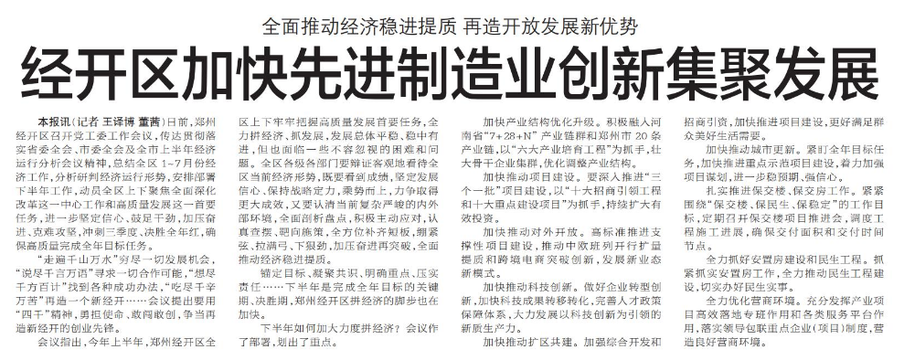 日前,郑州经开区召开党工委工作会议,传达贯彻落实省委全会、市委全会及全市上半年经济运行分析会议精神,总结全区 1~7月份经济工作,分析研判经济运行形势,安排部署下半年工作,动员全区上下聚焦全面深化改革这一中心工作和高质量发展这一首要任务,进一步坚定信心、鼓足干劲,加压奋进、克难攻坚,冲刺三季度、决胜全年红,确保高质量完成全年目标任务。(今日《郑州日报》7版)