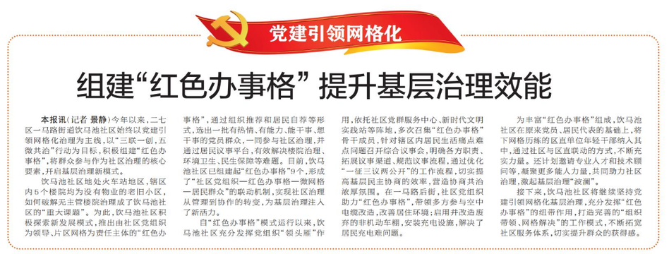 今年以来,二七区一马路街道饮马池社区始终以党建引领网格化治理为主线,以“三联一创,五微共治”行动为目标,积极组建“红色办事格”,将群众参与作为社区治理的核心要素,开启基层治理新模式。(今日《郑州日报》7版)
