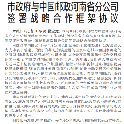 12月9日,市长何雄与中国邮政河南省分公司总经理熊勇武举行工作会谈,就深化务实合作充分沟通交流,共同见证市政府与中国邮政河南省分公司签署战略合作框架协议。(今日《郑州日报》1版)