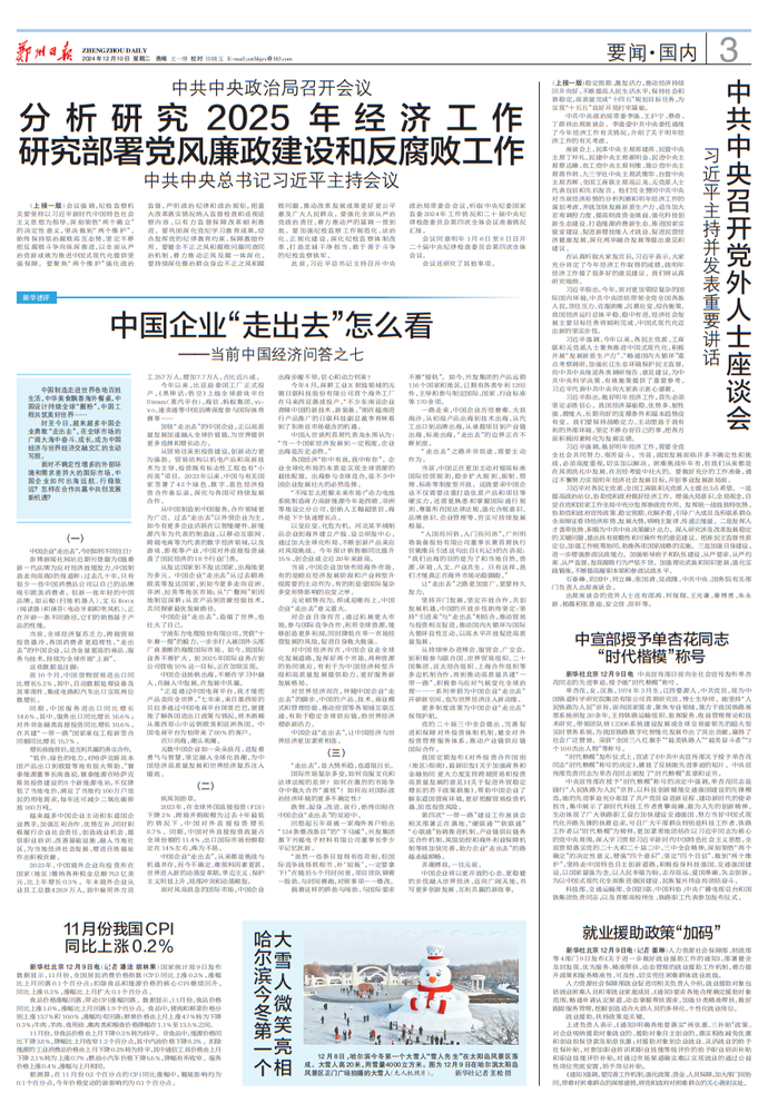 12月6日,中共中央在中南海召开党外人士座谈会,就今年经济形势和明年经济工作听取各民主党派中央、全国工商联负责人和无党派人士代表的意见和建议。中共中央总书记习近平主持座谈会并发表重要讲话强调,明年是“十四五”规划收官之年,要以新时代中国特色社会主义思想为指导,全面贯彻落实中共二十大和二十届二中、三中全会精神,坚持稳中求进工作总基调,完整准确全面贯彻新发展理念,加快构建新发展格局,扎实推动高质量发展,进一步全面深化改革,扩大高水平对外开放,建设现代化产业体系,更好统筹发展和安全,实施更加积极有为的宏观政策,扩大国内需求,推动科技创新和产业创新融合发展,稳住楼市股市,防范化解重点领域风险和外部冲击,稳定预期、激发活力,推动经济持续回升向好,不断提高人民生活水平,保持社会和谐稳定,高质量完成“十四五”规划目标任务,为实现“十五五”良好开局打牢基础。(今日《人民日报》1版)