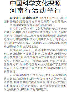 12月4日至6日,由中国科协联合河南省科协共同组织的“文明的烛火——中国科学文化探源河南行活动”举行。(今日《郑州日报》2版)