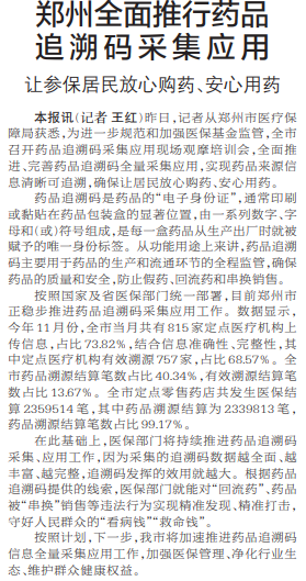 昨日,记者从郑州市医疗保障局获悉,为进一步规范和加强医保基金监管,全市召开药品追溯码采集应用现场观摩培训会,全面推进、完善药品追溯码全量采集应用,实现药品来源信息清晰可追溯,确保让居民放心购药、安心用药。(今日《郑州日报》2版)