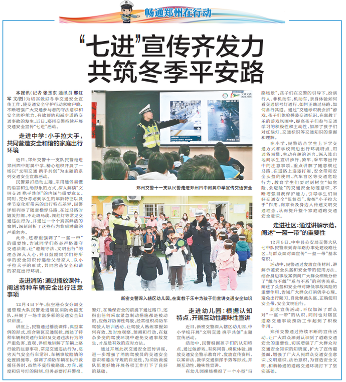 为切实做好冬季交通安全宣传工作,使交通安全守护行动家喻户晓,不断增强广大交通参与者的守法意识和安全防护能力,有效预防和减少道路交通事故的发生,近日,郑州交警持续开展交通安全宣传“七进”活动。(今日《郑州日报》5版)