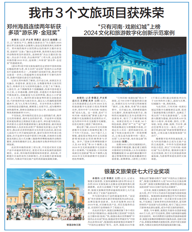 近日,文化和旅游部正式公布2024文化和旅游数字化创新示范优秀案例名单,郑州中牟“只有河南·戏剧幻城”成功入选。这一荣誉,是对“只有河南·戏剧幻城”探索文旅产业的数字化发展路径及成果的认可,也为郑州中牟在文旅数字化赋能、信息化转型上提供了鲜活样本。(今日《郑州日报》7版)