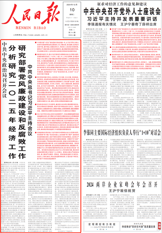 中共中央政治局12月9日召开会议,分析研究2025年经济工作;听取中央纪委国家监委工作汇报,研究部署2025年党风廉政建设和反腐败工作。中共中央总书记习近平主持会议。(今日《人民日报》1版)