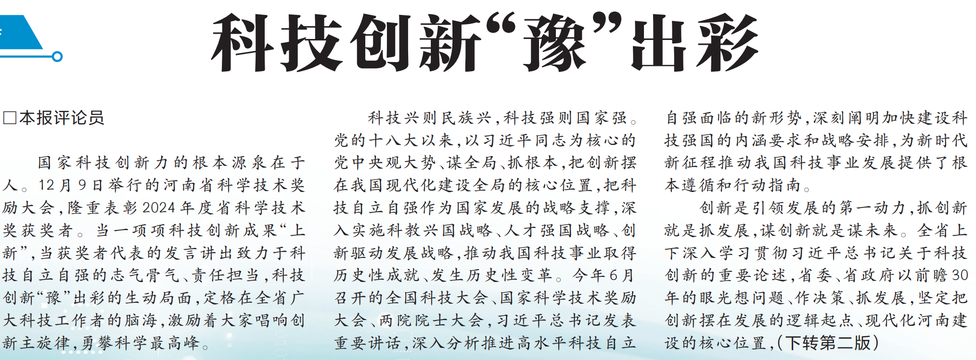 国家科技创新力的根本源泉在于人。12月9日举行的河南省科学技术奖励大会,隆重表彰2024年度省科学技术奖获奖者。当一项项科技创新成果“上新”,当获奖者代表的发言讲出致力于科技自立自强的志气骨气、责任担当,科技创新“豫”出彩的生动局面,定格在全省广大科技工作者的脑海,激励着大家唱响创新主旋律,勇攀科学最高峰。(今日《河南日报》1版、2版)