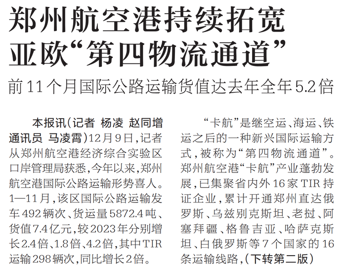 12月9日,记者从郑州航空港经济综合实验区口岸管理局获悉,今年以来,郑州航空港国际公路运输形势喜人。1—11月,该区国际公路运输发车492辆次、货运量5872.4吨、货值7.4亿元,较2023年分别增长2.4倍、1.8倍、4.2倍,其中TIR运输298辆次,同比增长2倍。(今日《河南日报》1版、2版)