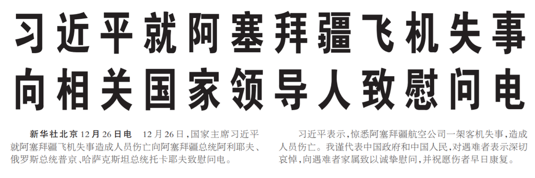 12月26日,国家主席习近平就阿塞拜疆飞机失事造成人员伤亡向阿塞拜疆总统阿利耶夫、俄罗斯总统普京、哈萨克斯坦总统托卡耶夫致慰问电。(今日《人民日报》1版)