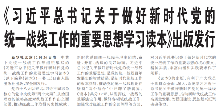 中共中央统一战线工作部组织编写的《习近平总书记关于做好新时代党的统一战线工作的重要思想学习读本》(以下简称《读本》)一书,近日由人民出版社出版,在全国发行。(今日《人民日报》1版)