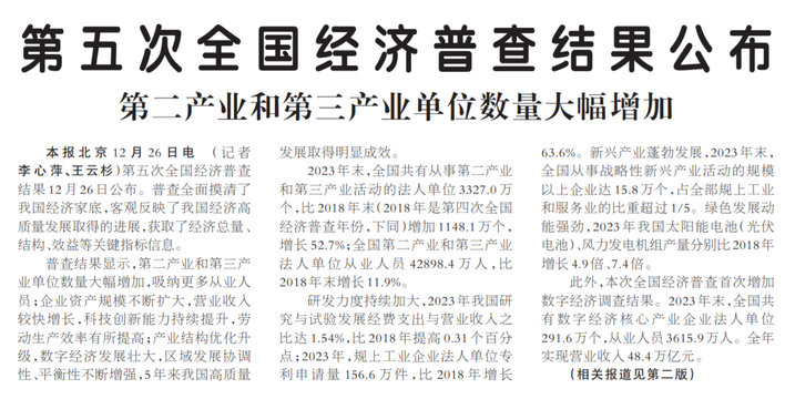 第五次全国经济普查结果12月26日公布。普查全面摸清了我国经济家底,客观反映了我国经济高质量发展取得的进展,获取了经济总量、结构、效益等关键指标信息。(今日《人民日报》1版)