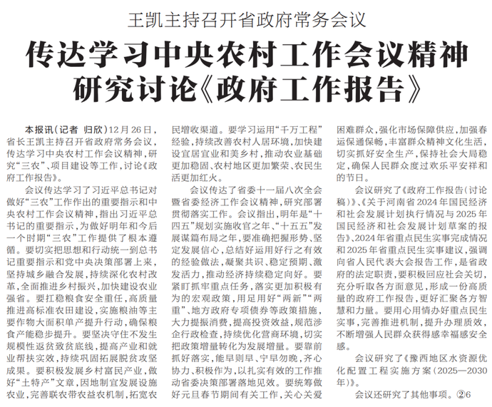 12月26日,省长王凯主持召开省政府常务会议,传达学习中央农村工作会议精神,研究“三农”、项目建设等工作,讨论《政府工作报告》。(今日《河南日报》1版)