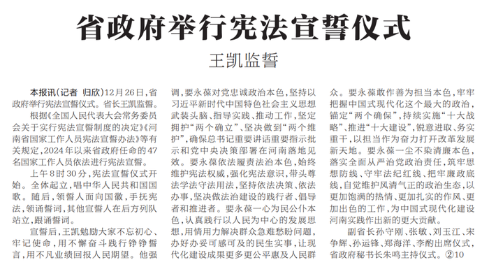 12月26日,省政府举行宪法宣誓仪式。省长王凯监誓。