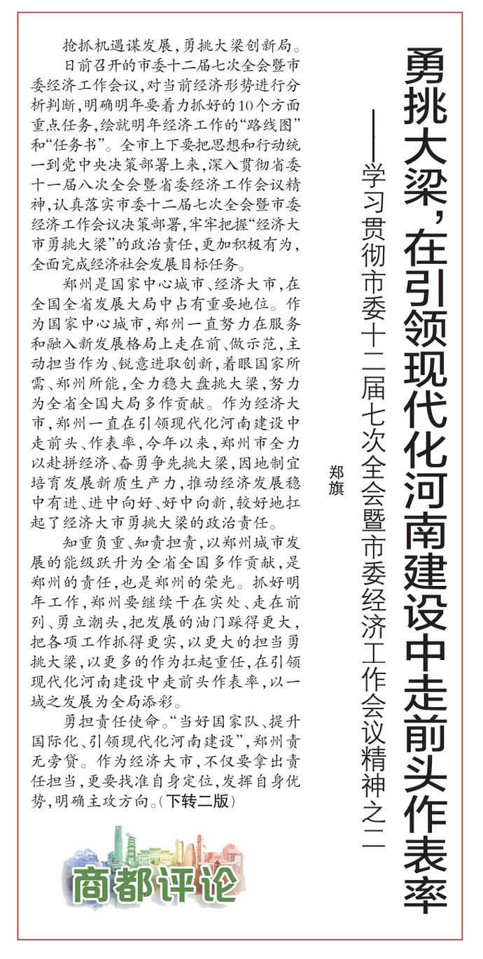 日前召开的市委十二届七次全会暨市委经济工作会议,对当前经济形势进行分析判断,明确明年要着力抓好的10个方面重点任务,绘就明年经济工作的“路线图”和“任务书”。全市上下要把思想和行动统一到党中央决策部署上来,深入贯彻省委十一届八次全会暨省委经济工作会议精神,认真落实市委十二届七次全会暨市委经济工作会议决策部署,牢牢把握“经济大市勇挑大梁”的政治责任,更加积极有为,全面完成经济社会发展目标任务。(今日《郑州日报》1版、2版)