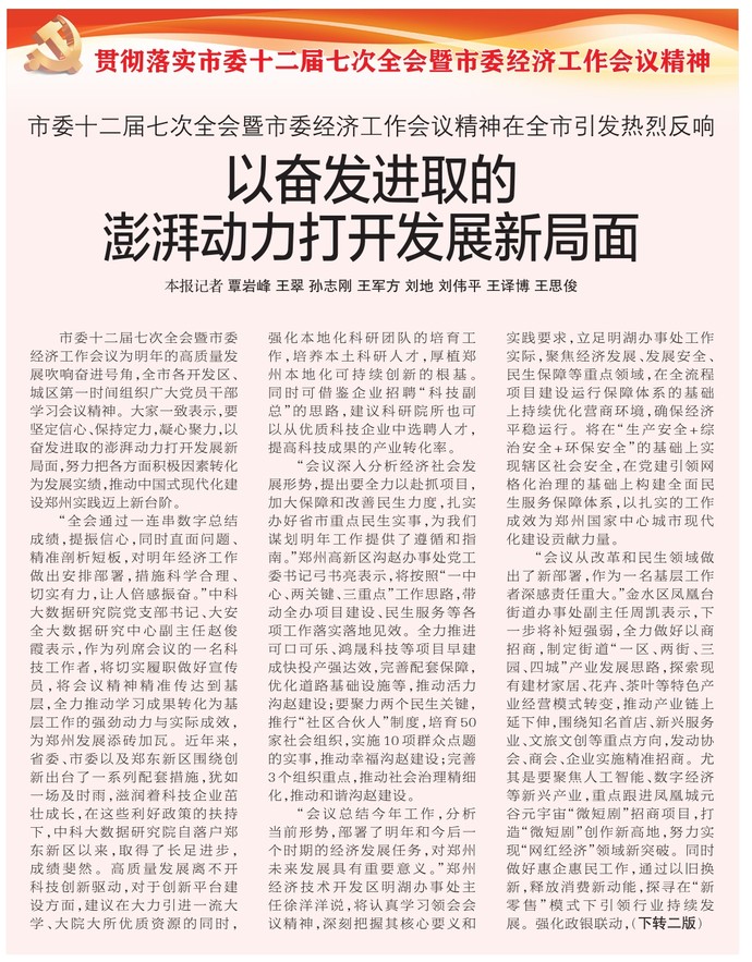 市委十二届七次全会暨市委经济工作会议为明年的高质量发展吹响奋进号角,全市各开发区、城区第一时间组织广大党员干部学习会议精神。大家一致表示,要坚定信心、保持定力,凝心聚力,以奋发进取的澎湃动力打开发展新局面,努力把各方面积极因素转化为发展实绩,推动中国式现代化建设郑州实践迈上新台阶。(今日《郑州日报》1版、2版)