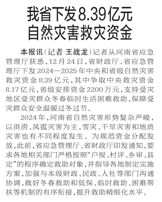记者从河南省应急管理厅获悉,12月24日,省财政厅、省应急管理厅下发2024—2025年中央和省级自然灾害救灾资金8.39亿元,其中争取中央救灾资金8.17亿元,省级安排资金2200万元,支持受灾地区受灾群众冬春临时生活困难救助,保障受灾群众安全温暖过冬过节。(今日《郑州日报》2版)